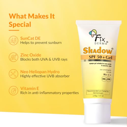 Specification: Fixderma Shadow Sunscreen SPF 50+ PA+++ Gel Broad Spectrum Sunscreen For UVA & UVB Protection | Unisex (40 g (Pack of 1), 50,All Skin Sun…