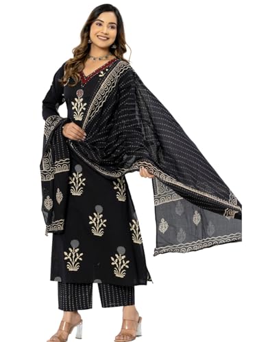 rytras Women’s Cotton Printed Straight Kurta with Pant and Dupatta Set