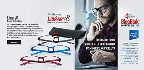 DR.HARMANN’S READING GLASSES FITTED WITH BLUE BLOCK LENS (Model: Library 8 Computer Readers with Blue Light Blocking and Blue Rays filter), ,