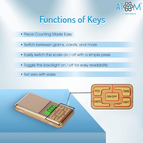 - MULTI-PURPOSE DEVICE: This beautiful pocket weight machine will compliment your modern shop, kitchen. Atom’s handheld weighing scale digital, is perfect for precision weighing on-the-go for all kinds of items or objects such as gold, silver, chemical, gems, coins, jewellery.