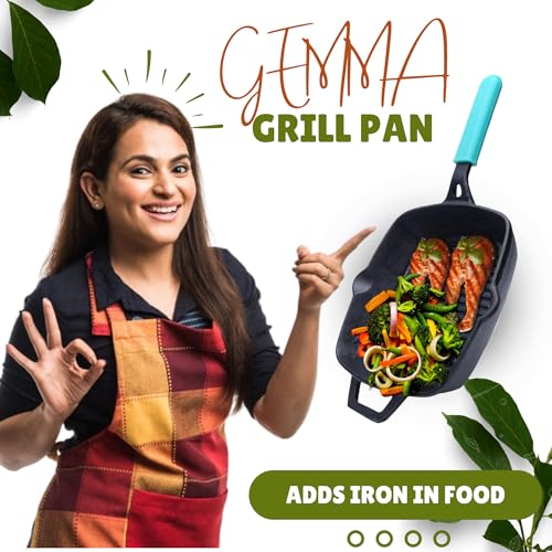 GEMMA Cast Iron Grill Pan with Silicone Grip(2L) 24cm|Pre-Seasoned|Gas Stove Compatible |100% Pure Cast Iron |Non Toxic|Stick Free -Weight (2.4…