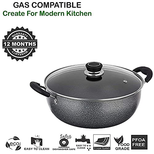 MUMMA LIFE Non-Stick Kadhai with Glass Lid (26 cm, Hammertone Finish, 3 Coat, 3mm Thickness), Aluminium (Grey)