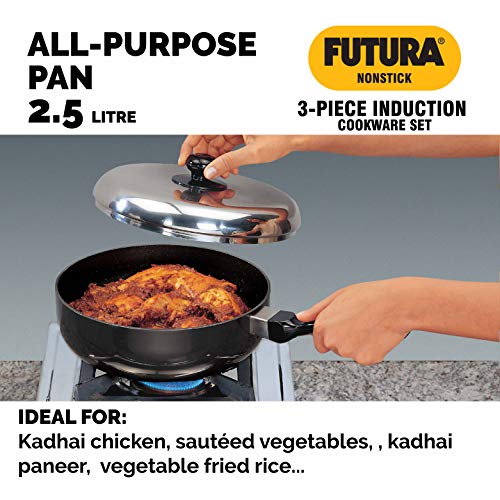 Hawkins Futura 3 Pieces Cookware Set 3 – Non Stick Flat Tava, All-Purpose Pan, Stir Fry Kadhai and Two Stainless Steel Lids, Black (NSET3)