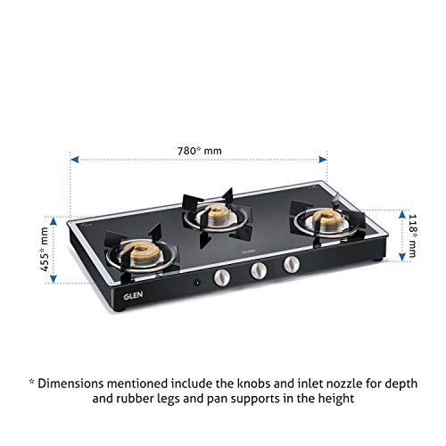 Specification: Glen 3 Burner LPG Gas Stove Mirror Finished Glass High Flame Forged Brass Burner, Auto Ignition, Extra Wide Black (1038 GT FB MBL AI)