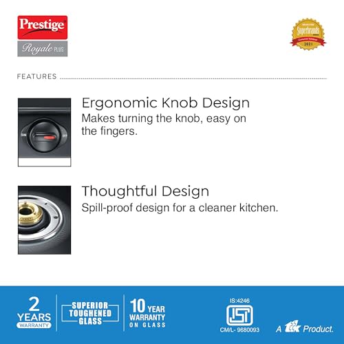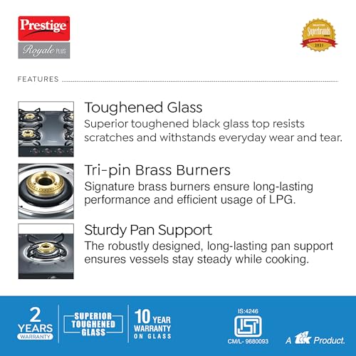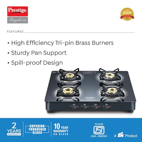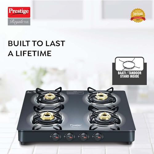 2 reviews for Prestige Royale Plus GT 04 Toughened Black Glass Top Gas Stove(Manual, 4 Brass Burners, Black, Baati/Tandoor Stand Inside)