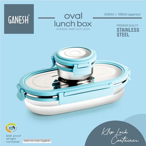 GANESH Oval Stainless Steel Airtight Leak-Proof Lunch Box for Office, School, Picnic – 750 Ml-Blue,