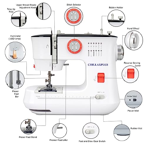 - - : CHILLAXPLUS stitching machine for home tailoring features 12 built-in stitch patterns—straight line, decorative lines, blind hem lines, and buttonholes—to fulfill all your day-to-day stitching requirements.