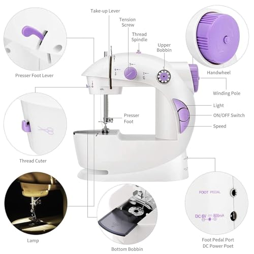 - All-in-One Sewing Starter Kit – Get stitching right out of the box! Includes threads, bobbins, extension table, foot pedal, scissors, needles, threader, measuring tape & more.