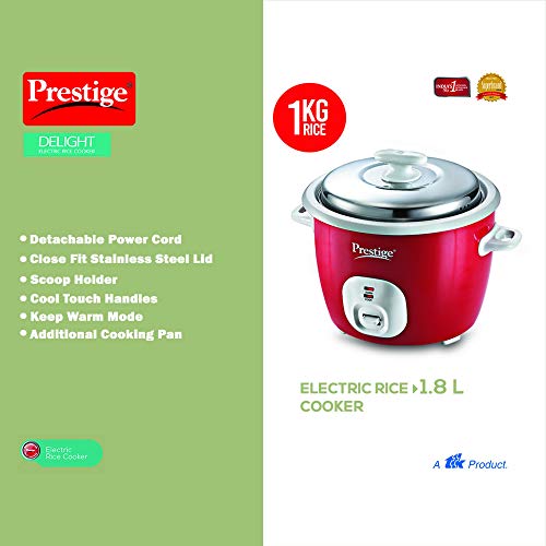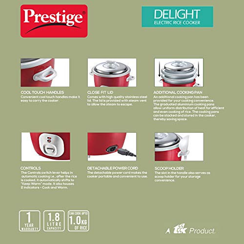 Specification: Prestige Delight Electric Rice Cooker Cute 1.8-2 700 watts with 2 Aluminium Cooking Pans (1.8 Liters, Red)