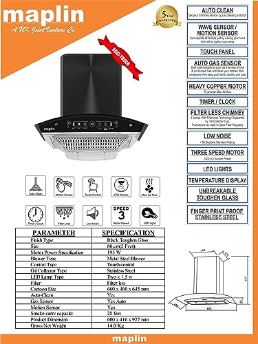Specification: Maplin Eco Touch Control Filterless Kitchen Chimney in 60cm with Auto Clean, Wave Sensor Features