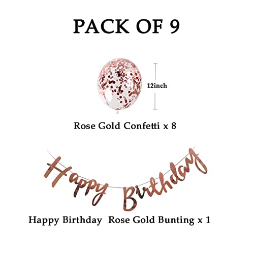 - Package Include :- 1) 1 x Rosegold Bunting (Happy Birthday) 2) 8 x RoseGold confetti Balloons